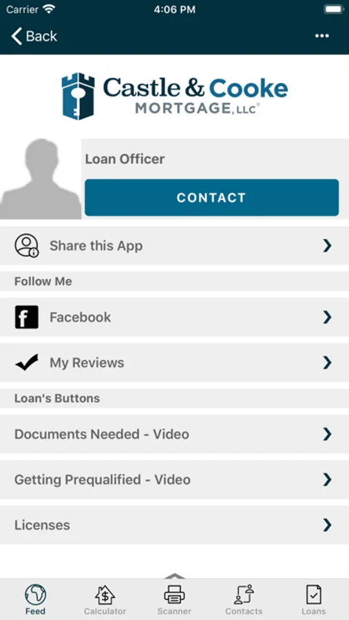 - Communication: View contact information for your real estate agent and your Castle & Cooke Mortgage Loan Officer with the option of contacting them through the App.