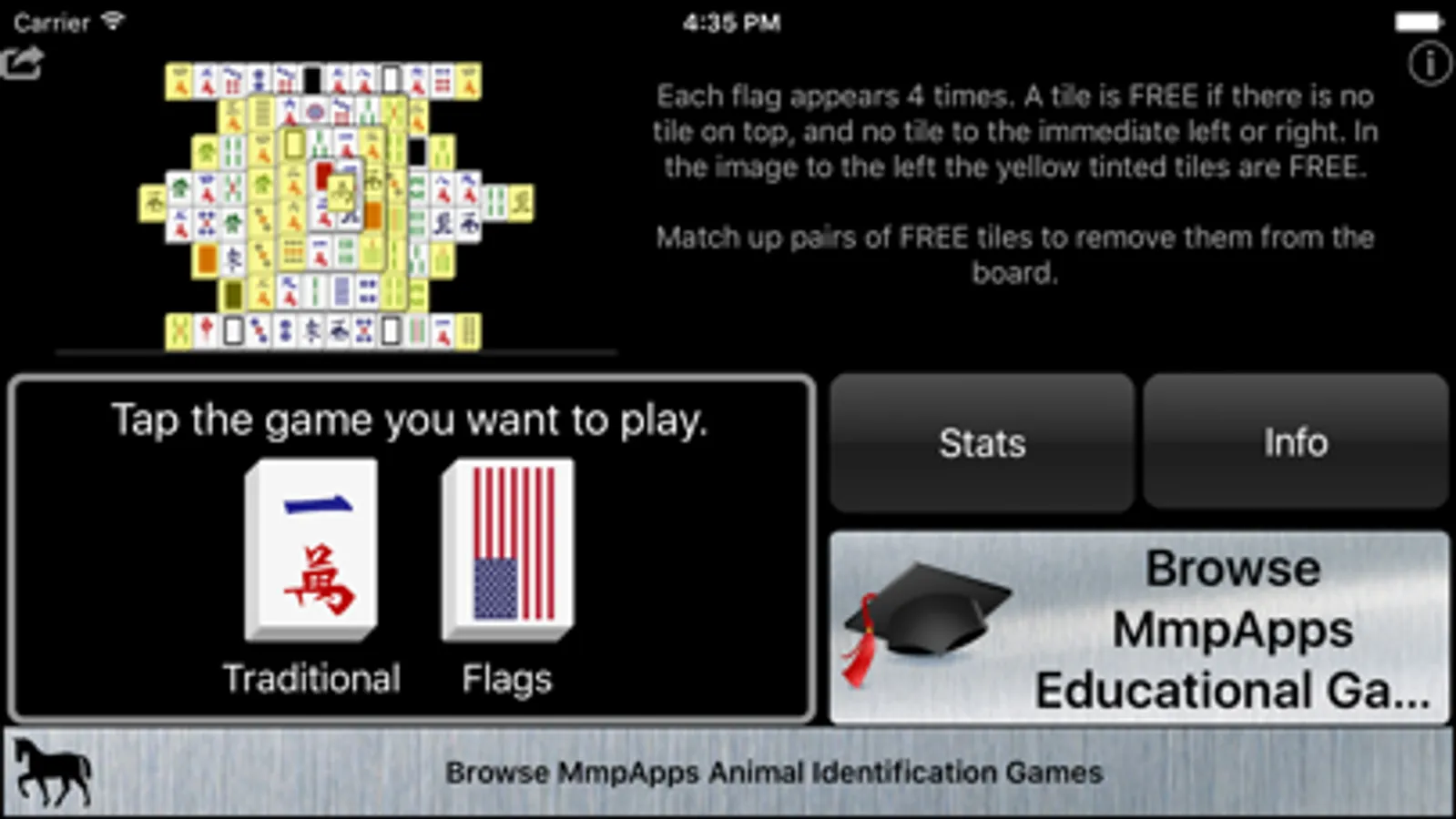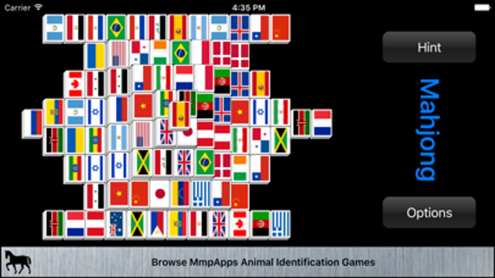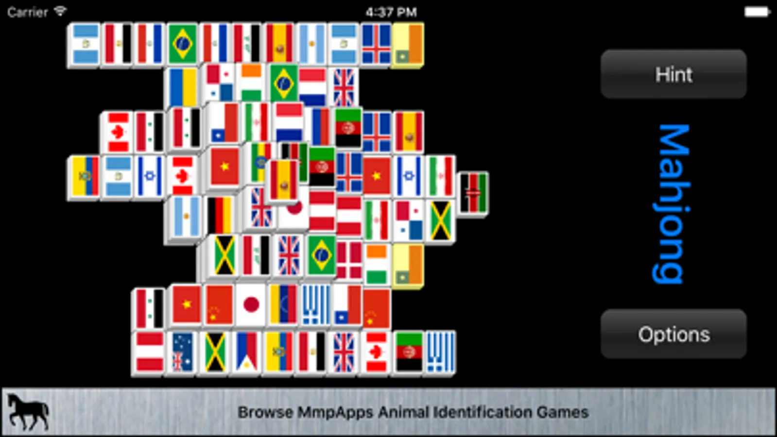 Traditional Mahjong solitaire played with standard tiles or flags of the world.