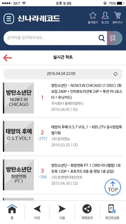 - 신나라레코드의 모든 상품 (음반, DVD, 아티스트 굿즈 상품 등) 검색이 가능하며,