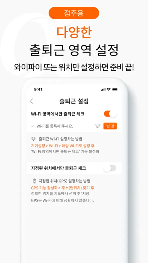 - 점주님이 선택한 영역(Wi-Fi or GPS)에서만 출퇴근이 한정되도록 설정 가능합니다.
