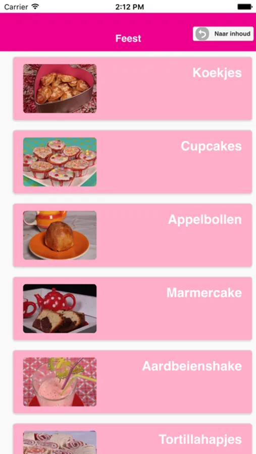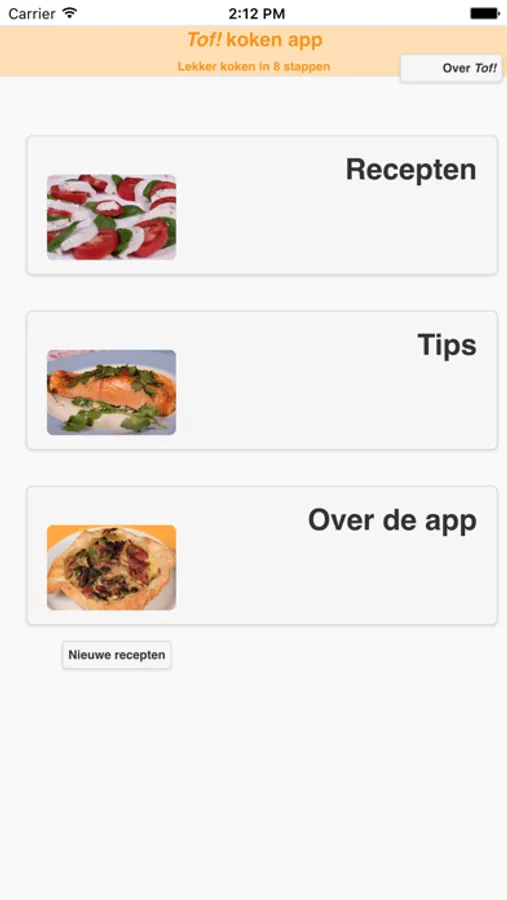 De recepten zijn verdeeld over 5 hoofdstukken. Ieder hoofdstuk heeft een andere kleur. Je vindt lekkere hapjes voor een feest of voor bij de lunch. Maar er staan ook voorafjes, hoofdgerechten en toetjes in deze app. Je kunt dus een heel menu maken.