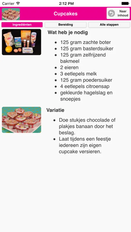 In deze app staan meer dan 60 recepten. Bij elk recept staan 8 foto’s met uitleg. Zo kun je stap voor stap lekkere gerechten maken.