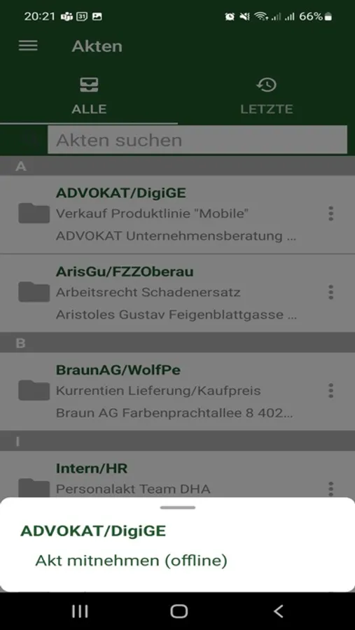 Mit ADVOKAT mobil sind Sie mit Ihrem Back-Office verbunden. Sie können mit der App jederzeit auf Ihre Daten im Back-Office zugreifen und Sie können diese Daten auch offline verfügbar mitnehmen. Unterwegs sind diverse Bearbeitungen möglich, die auch in Ihr Back-Office übernommen werden (Leistungen erfassen, Dokumente & Dateien hinzufügen, Dokumente bearbeiten).