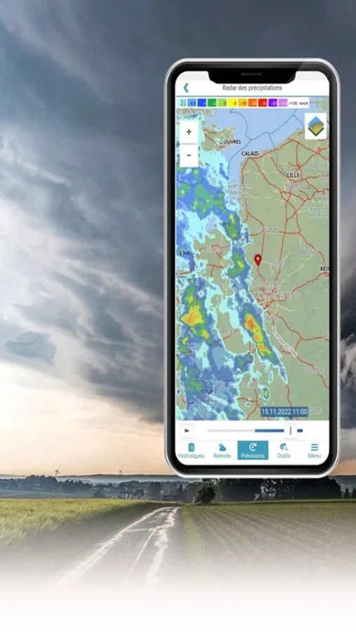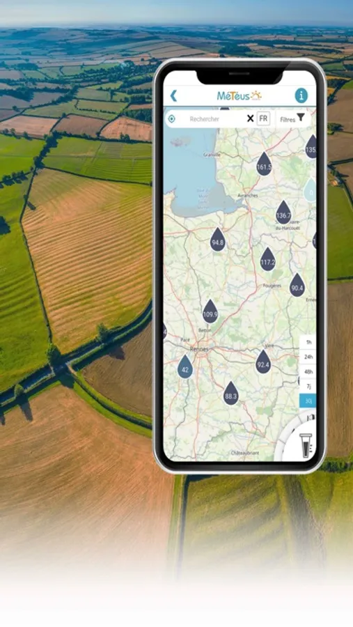 The Meteus application allows you to access the weather data of the stations of all members of the Meteus network, close to your home and everywhere in France. You thus have, without moving, the real weather conditions of your fields at 10, 20 or 30 km from your home ! This way you can easily compare the weather conditions of your favourite stations and optimize the organization of your work sites.