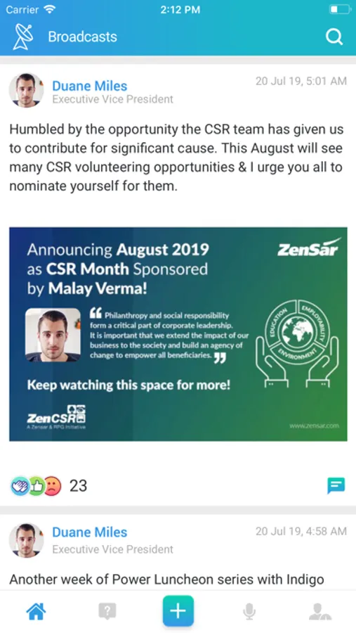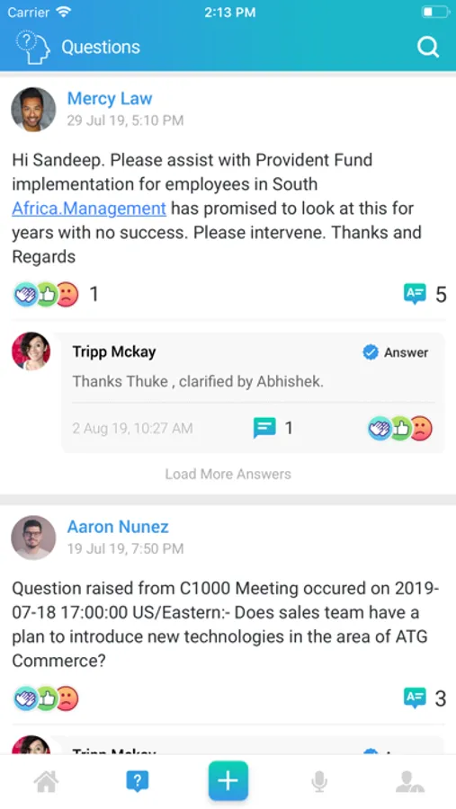 This application is used for posting questions and enabling discussions on a variety of topics. Notifications are received when a reply is received on questions posted by the user. Additionally associates can view broadcasts and announcements.