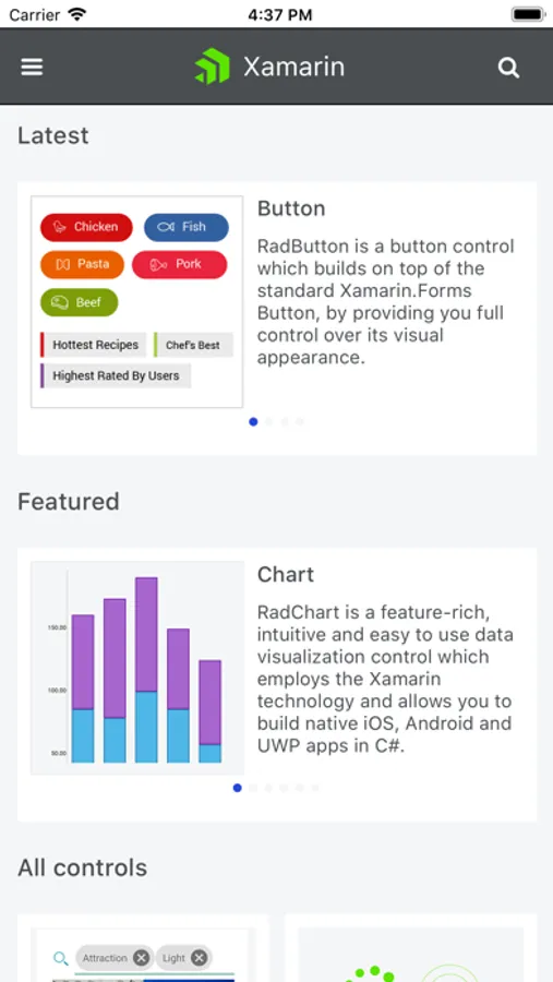 This application shows scenarios developers can achieve using Telerik UI for Xamarin. Browse the examples to get the first-hand experience with the suite. A Source code preview is available for every example.