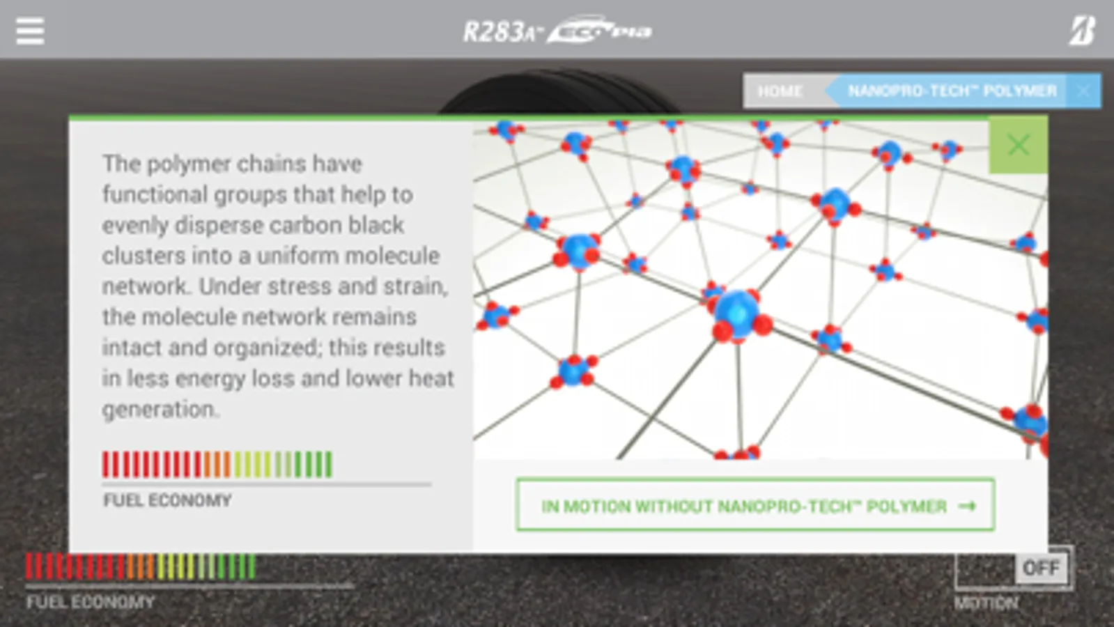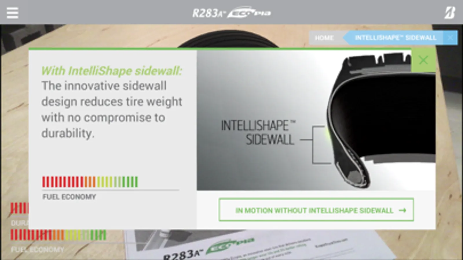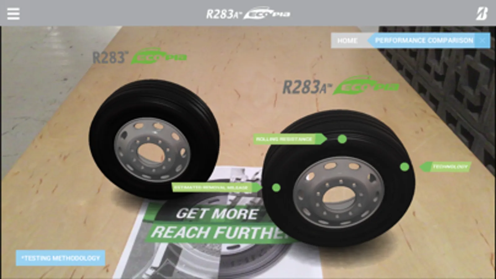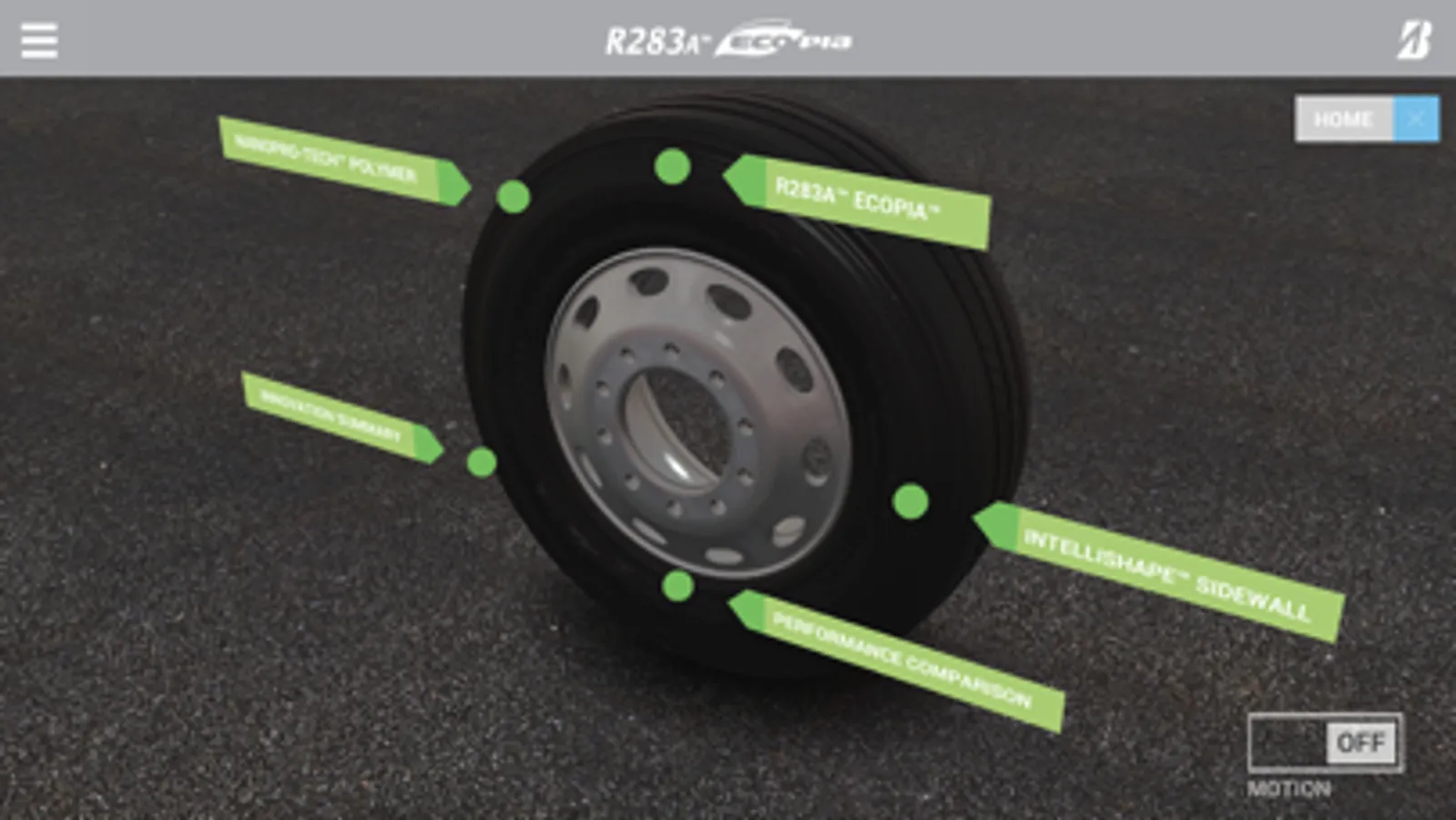 The Tire Explorer app is an engaging experience that lets you explore the features and benefits of Bridgestone’s R283A™ Ecopia™ commercial steer tire through augmented reality, or in 3D. This advanced tool demonstrates the tire’s innovative technology, interactively, like never before.