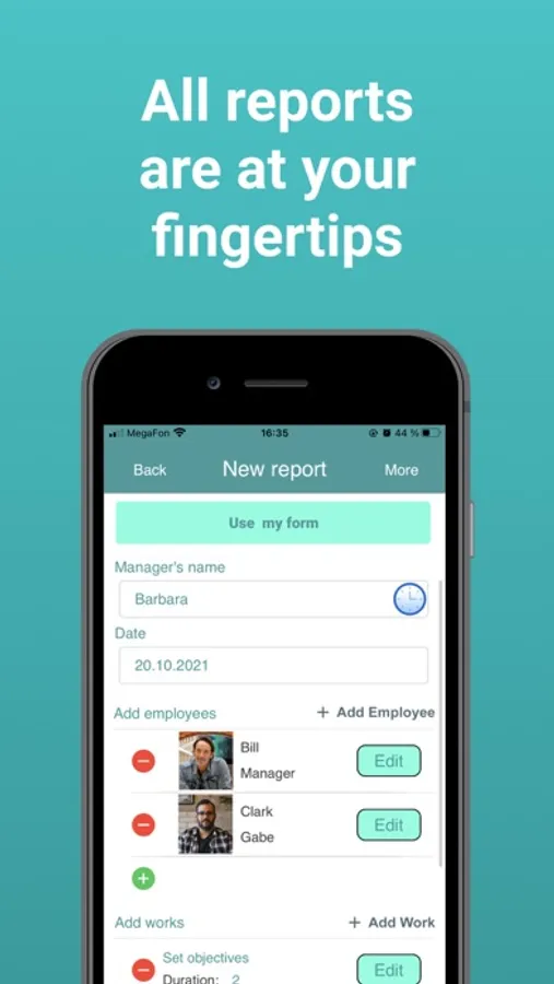 To work even faster managers/supervisors can create a database of employees and works to immediately select them from the list and pre-fill the report form.