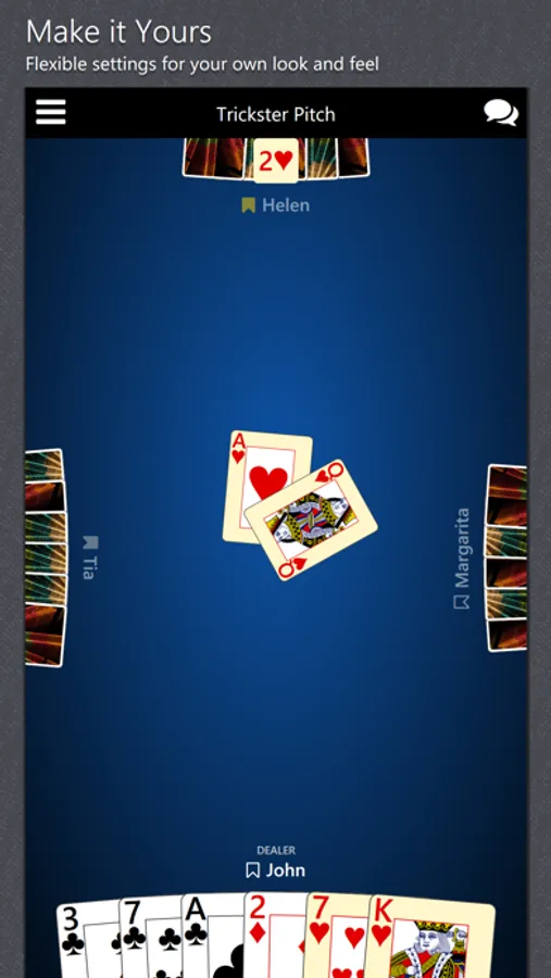 Play Pitch your way with customizable rules. Choose your favorite point variation, adjust who gets low point, decide if players can “Shoot the Moon,” and more.