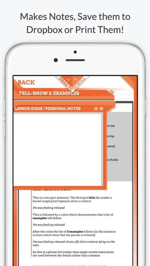 Finally, the app allows users to make and save their own personal notes/lesson plans directly in-app. You can also back them up to Dropbox and email them directly from the app: two handy tools for networks of schools seeking to share ideas and planning!