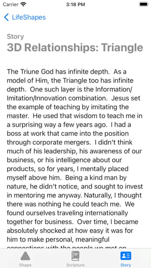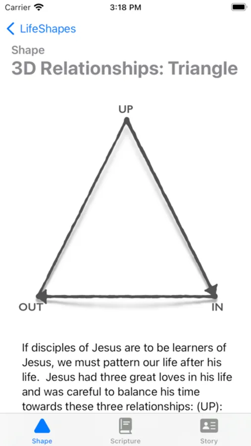 The LifeShapes App is a reference guide for the LifeShapes Discipleship language. The app allows interactive review of each of the LifeShape structures in graphical form. Additional Scripture, Shape, Story (SSS) information can be viewed for most shapes as well. Some of the LifeShapes include their "Shadow" copy, which helps identify the false copies of Christ's Truths. Many of the LifeShapes include handy variations that we have encountered in our Discipleship practices, or as handed down by our Huddle leaders to us.