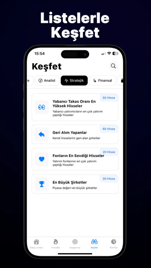 Otomatik olarak hazırladığımız ve sürekli güncellenen 50'den fazla tematik hisse listesi ile analiz yapın. Analistlerin önerdiği hisseleri, temel analize göre ucuz kalmış hisseleri keşfedin.