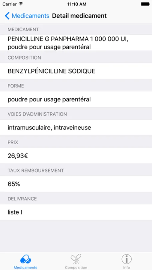 * details sur chaque medicament: forme de presentation, voies d'administration, prix recommandé, taux de remboursement, type de délivrance (sur ordonnance ou non);