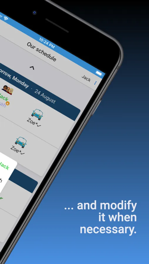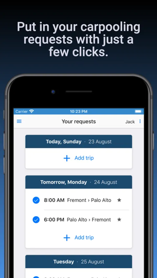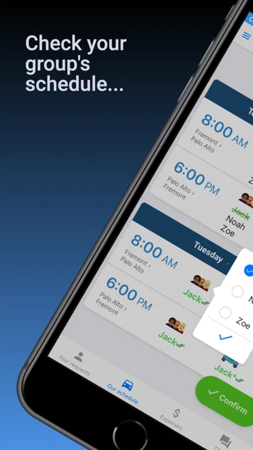 • Each user can select routes, days and times from the schedule of your carpool in a few seconds.