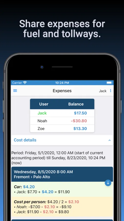 According to the requirements of your carpool, you can simply use MyCarpoolApp to know always who of your buddies wants to share a ride and whose turn it is to drive. If you have more advanced needs, MyCarpoolApp helps you estimate reliably and easily the costs to share either by assigning fixed amounts to each or your routes, or by taking into account variables like fuel type and fuel consumption of each car, highway tolls, discounts, and other costs per mile.