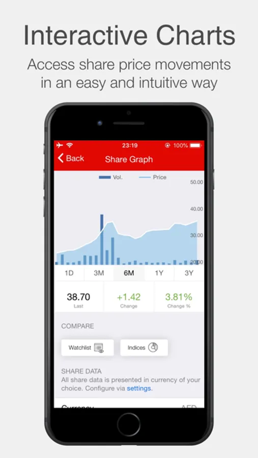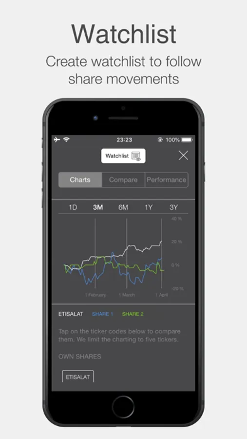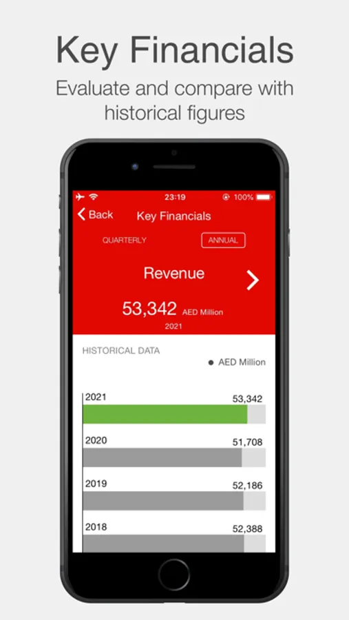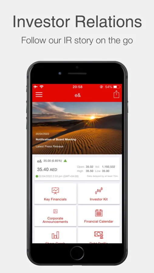The e& Investor Relations app will keep you up-to-date with the latest share price data, stock exchange and press releases, IR calendar events and much more.