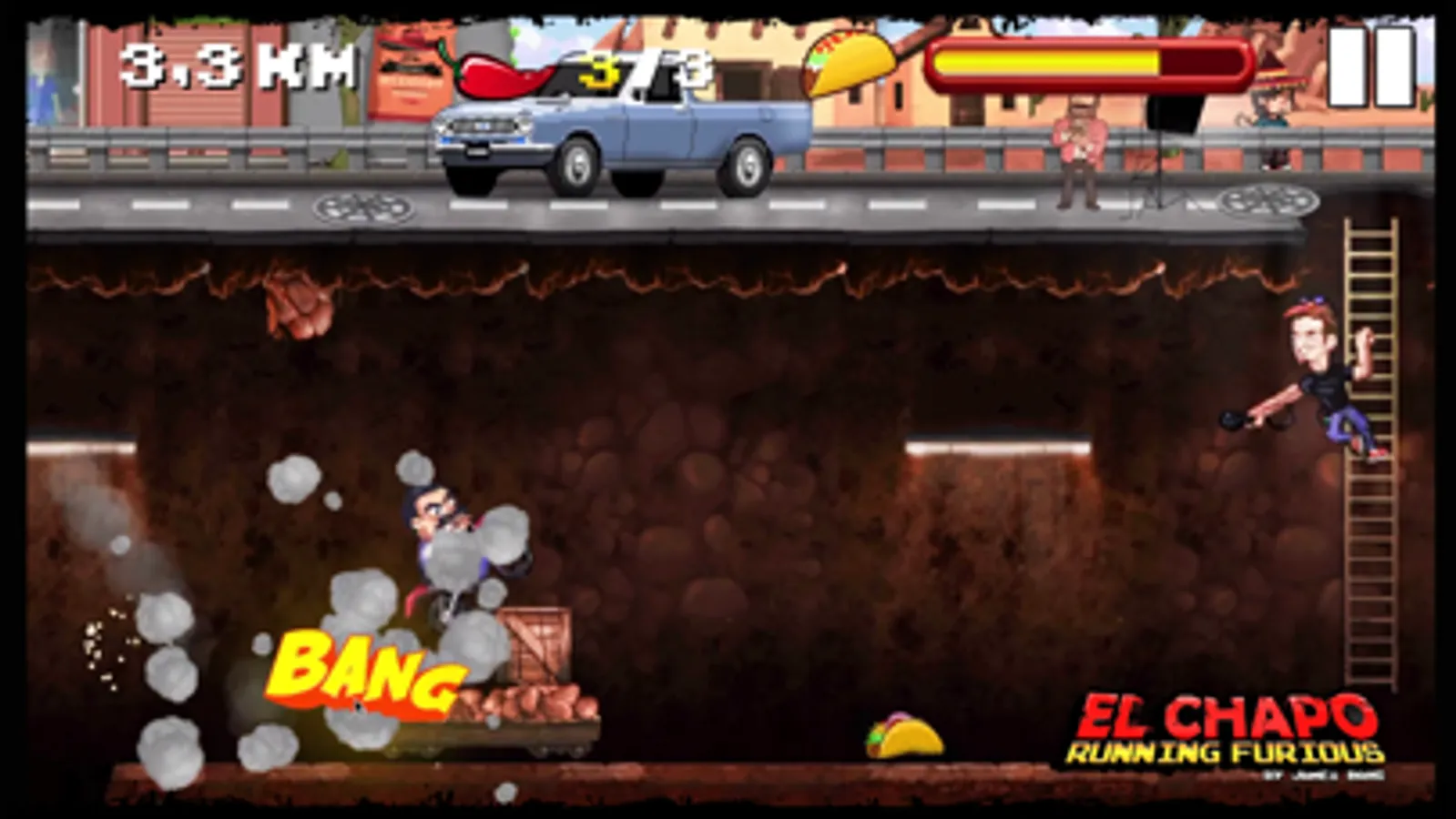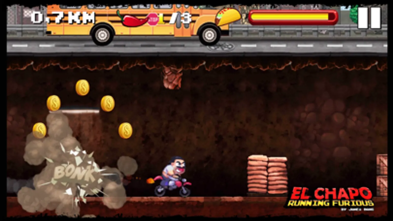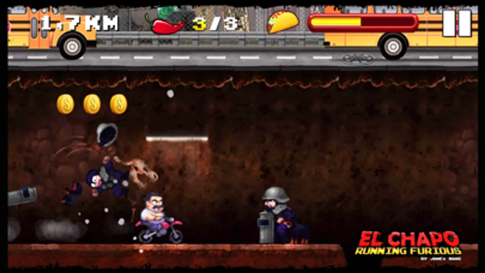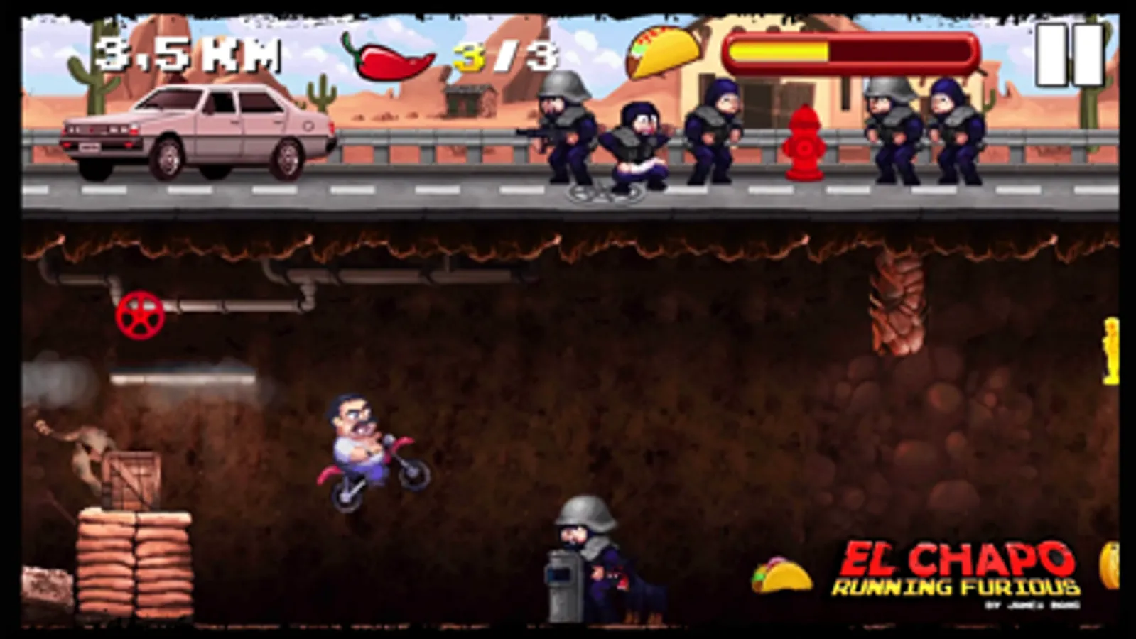 In "El Chapo - Running Furious!" you play as El Chapo and ride his motocross to escape a high security prison. Jump, ride, brake - you gotta hurry man, the Mexican feds are after you! But don't forget who you are: the famous El Chapo, a wannabe star. Will you seduce the sizzling women you meet on your journey? Will you raise your own celebrity by agreeing to give superstar Sean Pan your exclusive interview? Or maybe even cut a Hollywood deal? Don't miss the milestones or surrender!