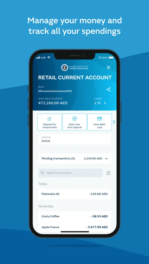 - Transfer funds instantly within & outside the UAE to saved beneficiaries