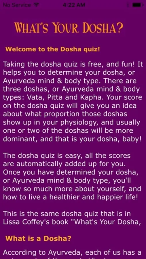 Your dosha is your ayurvedic mind/body type: Vata, Pitta, or Kapha. What's Your Dosha, Baby? Take the quiz and find out! 24 simple questions help you get to know yourself and your nature. From Ayurveda Expert Lissa Coffey. Gain insight into Ayurveda, the Science of Life. More info on our website: WhatsYourDosha.com