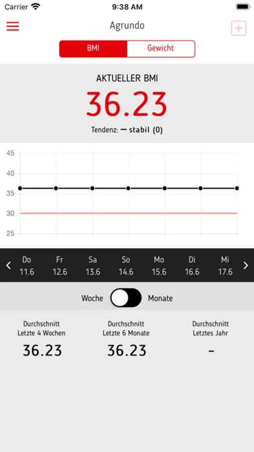 Mit Agrundo haben Sie das optimale Tool zur Dokumentation Ihres Gewichts direkt in der Hosentasche. Sehen Sie Ihren Gewichts- und BMI-Verlauf und dokumentieren Sie Symptome tagesaktuell. Die App erinnert Sie sogar laufend daran, Ihr Gewicht in die App einzutragen.