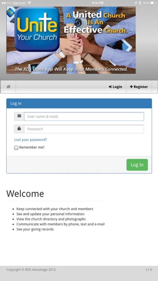 RDS Connect Unite® APP (Unite your church) is a series of features that allow members to access the church database and more easily communicate with each other. With the convenience of tablets and smartphones members have access to information of interest to them, can communicate with other members, update personal information, make contributions and payments, and more.