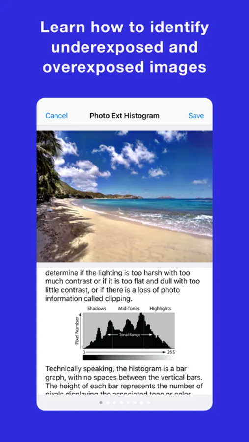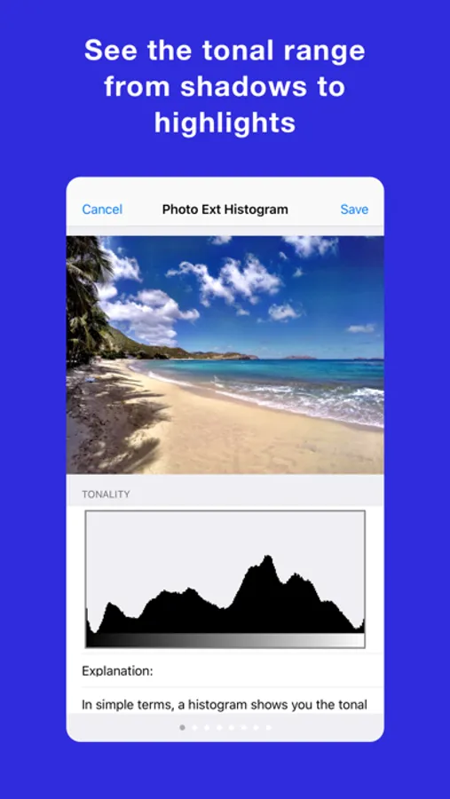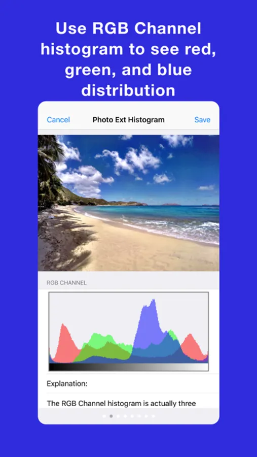 Photo Extension Histogram provides Tonality, RGB Channels, and Luminosity histograms for photos stored in the Apple Photos app for iPhone and iPad. This extension is great for photographers who need to analyze the tonal and color distribution of photos to identify underexposure, overexposure, and appropriate levels of contrast. The extension also explains, advises, and guides you on how to understand each histogram to be a great photographer!