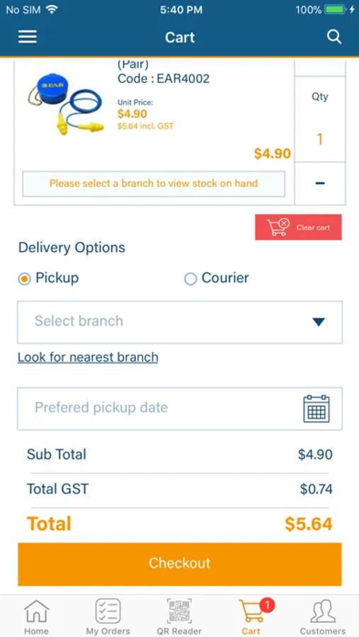 Cart: View the contents of your cart, select ‘pickup’ or ‘courier’ as delivery type and proceed to checkout