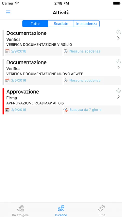 - possibilità di filtrare le attività visualizzate (tutte/ in scadenza / scadute), e vista immediata della scadenza (barra gialla o rossa);