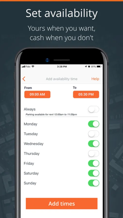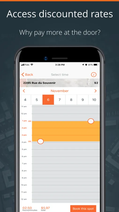 How does it work? Enter the address or browse spots on the map and simply compare prices and distance to your destination. We even display till when is the parking available or when it’s getting free, so you can schedule all your parking needs for the day, week or month with a few taps!