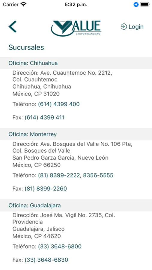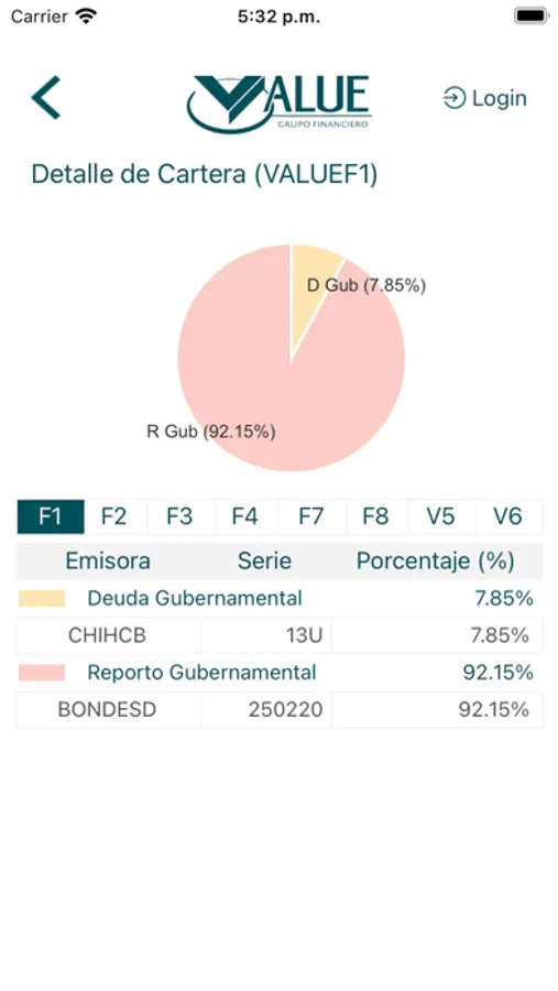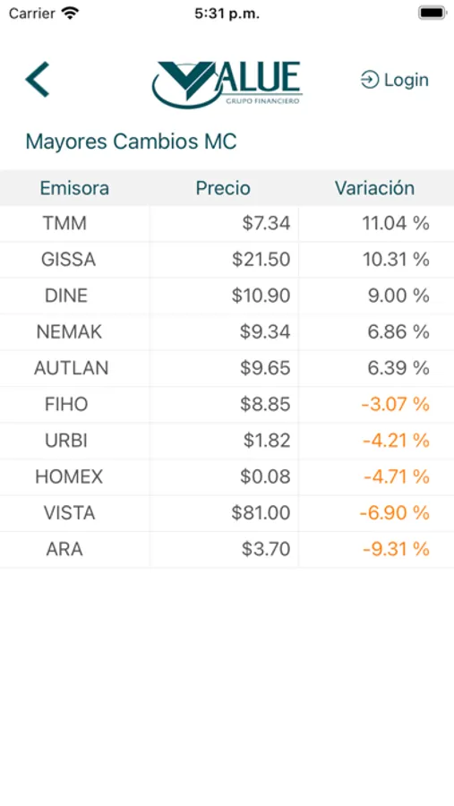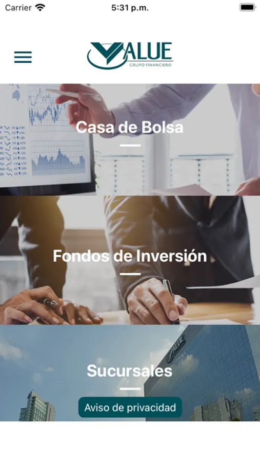 Value Móvil es una aplicación que permite consultar el estado de cuenta y facturas, ver el comportamiento del IPC, consultar los mayores cambios en acciones de la BMV, consultar rendimientos de Fondos de Inversión Value y ubicar las sucursales de Value Casa de Bolsa. Adicionalmente incluye consultas de Value Arrendadora, como son la lista de autos disponibles, avisos de cobro y facturas.