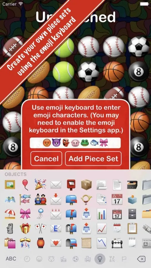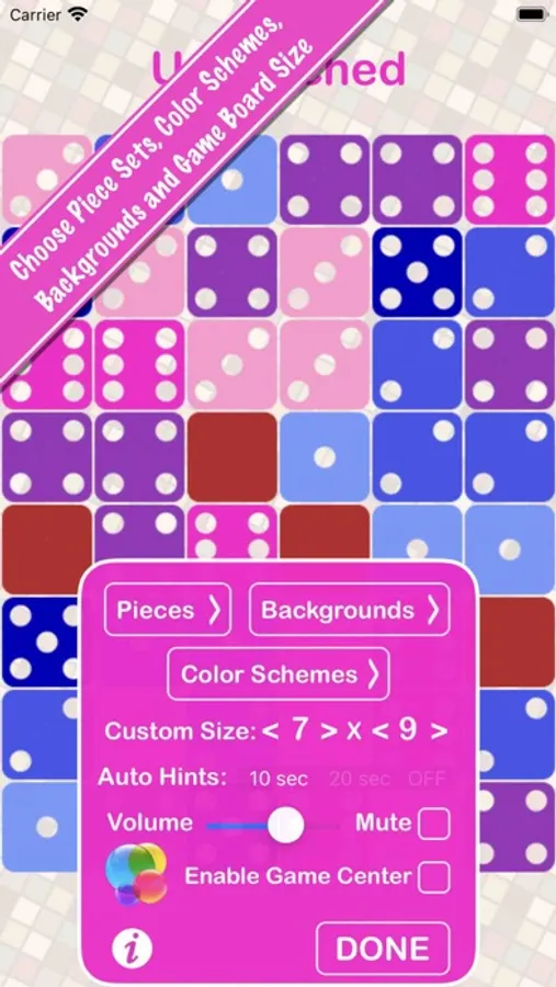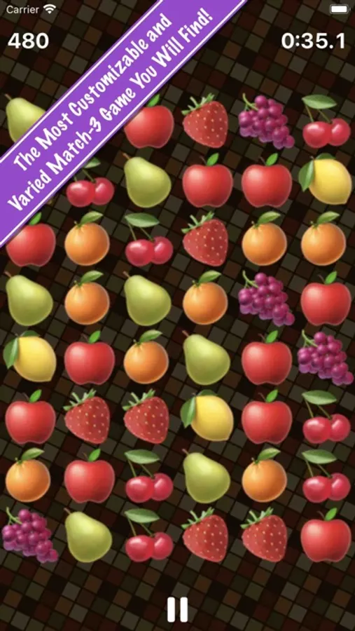 Do you enjoy match-3 games but get bored looking at the same pieces over and over? Ever wanted to customize the styling to match your tastes? Well then "Unmatched" is the game for you! It offers 20+ built-in piece sets, and allows you to create your own using the emoji keyboard for endless flexibility. In addition to piece sets, you can also select from multiple color schemes and backgrounds. And if you ever get tired of the built in color schemes, you can import your own! Select the piece sets, color schemes and backgrounds you like, and the game will randomly choose among them, to make each game unique.