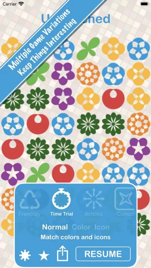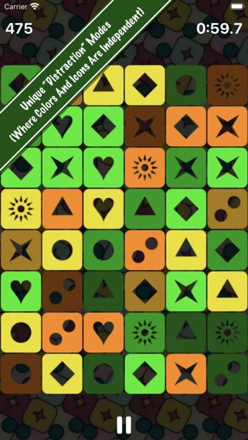 - novel "distraction" play modes, where piece colors don't match the icons. Can you focus on one without being distracted by the other?