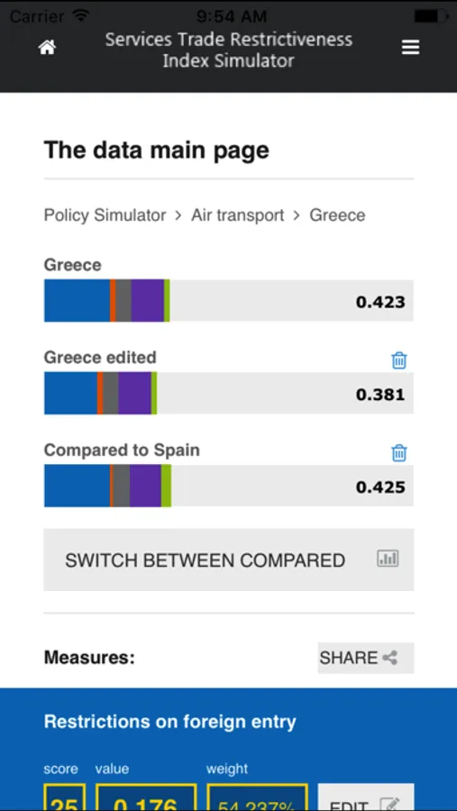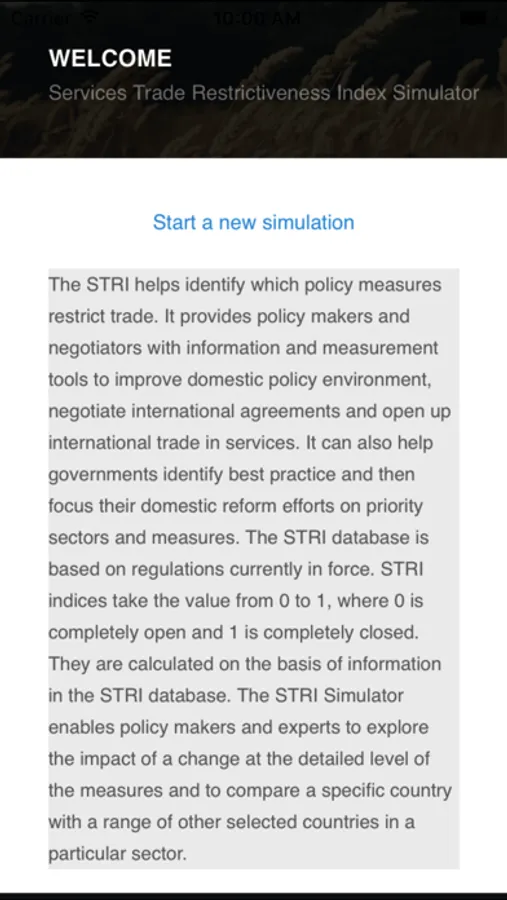 The STRI comprises a database, containing regulations currently in force, on the basis of which STRI indices are calculated. The indices are measured on a scale of 0 to 1, where 0 is completely open and 1 is completely closed. A handy STRI simulator allows the user to explore the impact of changes in any of the measures at a fairly detailed level. It also facilitates comparison of a selected country against a range of other countries, in a particular sector.