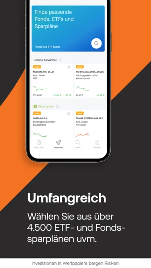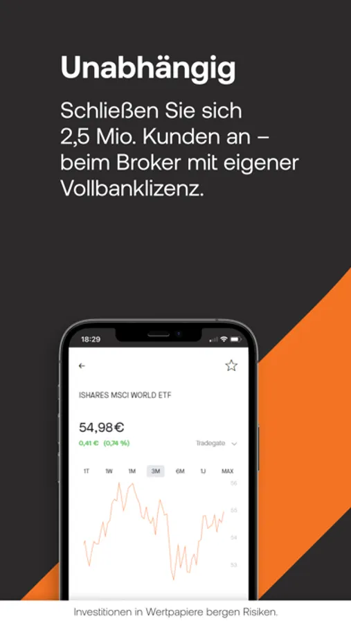 • Sie haben die Wahl aus mehr als 4.500 sparplanfähigen ETFs und Fonds, aus über 1 Million Anlagezertifikaten und Hebelprodukten von zahlreichen Premiumpartnern und vieles mehr. Entdecken Sie täglich neue Investmentmöglichkeiten auf Basis des Anlageverhaltens unserer Kunden.