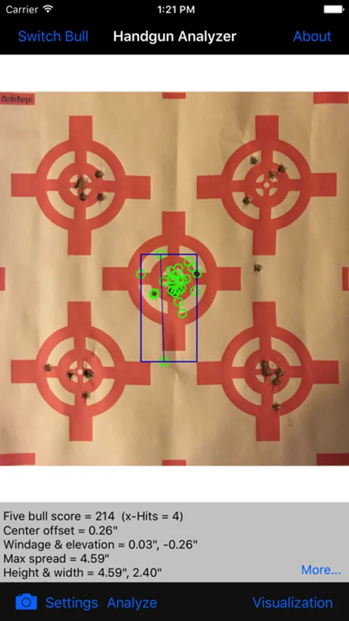 Handgun Analyzer allows a target shooter to quickly score & analyze their groups! This application uses our custom Turbo Targets and sophisticated image processing algorithms to automatically analyze your firearm’s performance from a cellphone photograph of your shot target. Simply shoot 1 to 5 groups on one of our patented targets, photograph the target, and analyze with our iPhone/iPad app to get accurate and detailed information about your grouping within 3-5 seconds. This application does not require a cellular connection to operate, so it will work fine at a remote gun club.