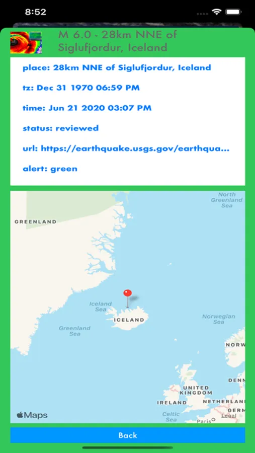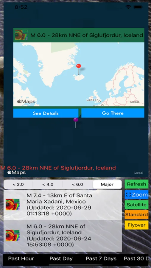 > Launch the Watch App and the app will communicate with the iOS App to get the nearest Earthquake information and also notify the iOS App to select and view the Earthquake. Click on the "Nearest Earthquake" button if you would like to search the nearest Earthquake again.