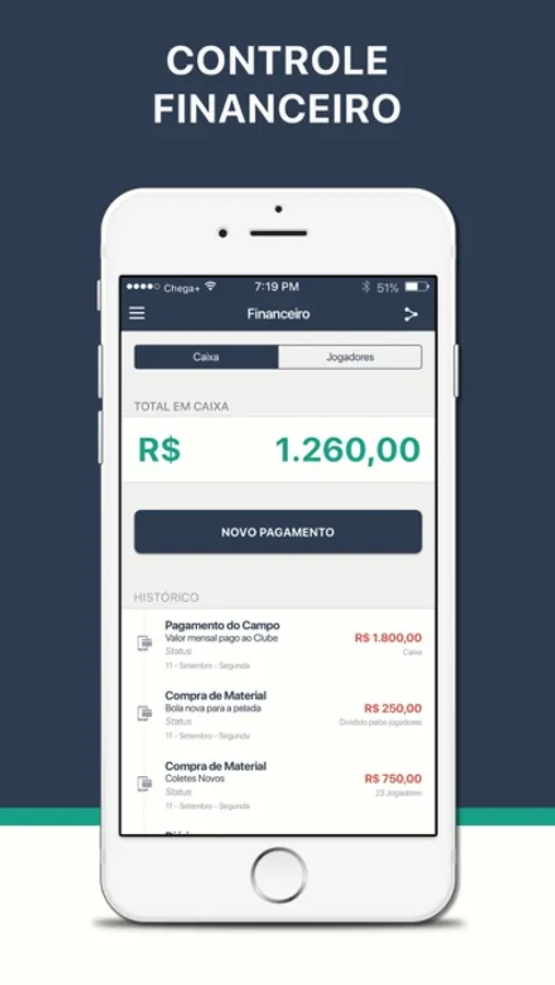Sabemos que a pelada não vive só de futebol, é preciso pagar os campos, comprar bola e coletes além de bancar aquele churrasco da resenha para a galera. Para facilitar a vida dos peladeiros o Chega+ possui o controle financeiro. Basta uma consulta ao Chega+ para saber quem está em dia e quem está enrolando na hora de pagar. Pague a pelada direto pelo Chega+.