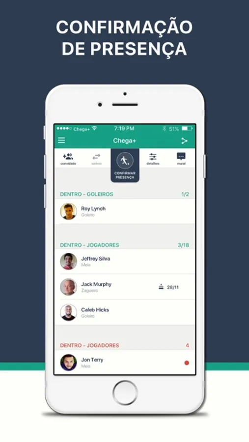 Com a pelada marcada, os peladeiros recebem uma notificação para confirmar sua presença e o Chega+ se encarrega de organizar em tempo real a lista de confirmados e avisar à todos quem vai participar.