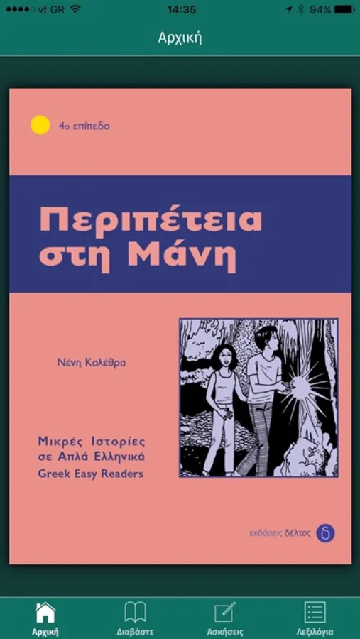 Τhe Greek Easy Reader Apps are language learning apps based on short stories accompanied by related exercises, which aim at improving the learner’s reading comprehension skills and building up their vocabulary. All stories are authored by experienced Greek language teachers. The narratives are original detective stories or adventure tales, which may be read and further exploited by the learner with or without the help of a teacher or dictionary. The series consists of 10 titles in 5 learning stages.