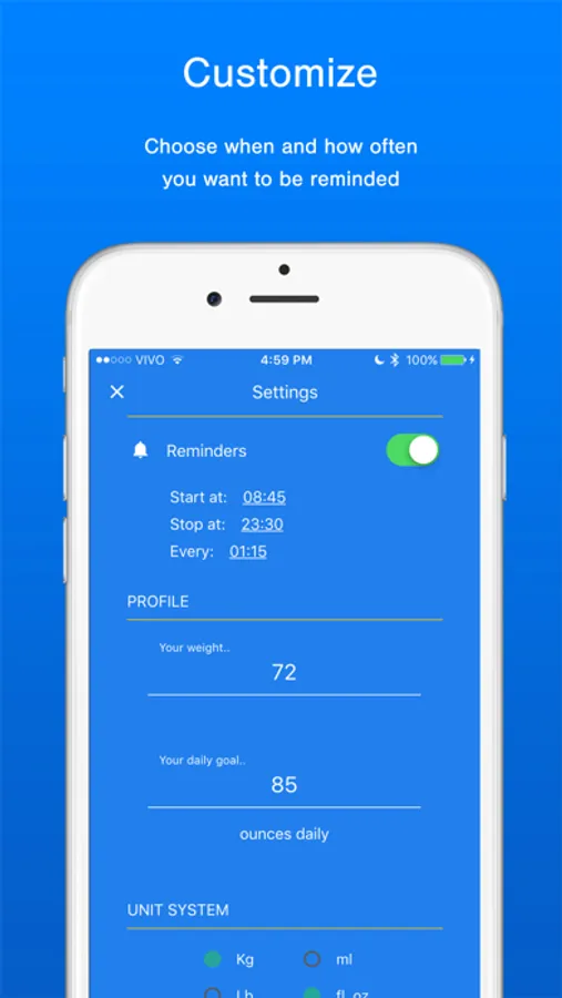 It calculates the recommended water intake you should drink according with your weight, then it will remind you to drink water throughout the day. Feel the difference in few days of use!