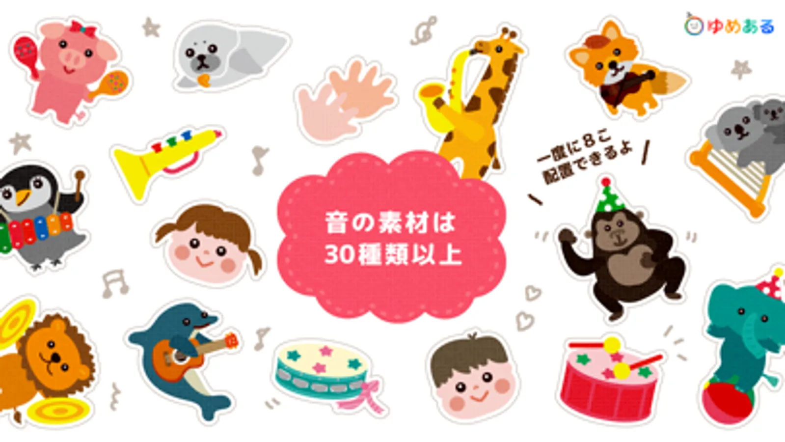 楽器やどうぶつの音素材は30種類以上。