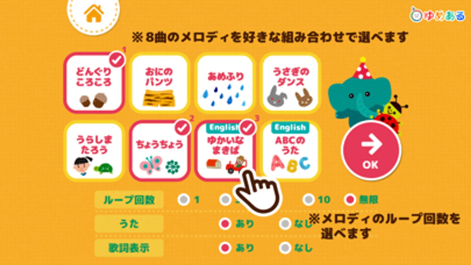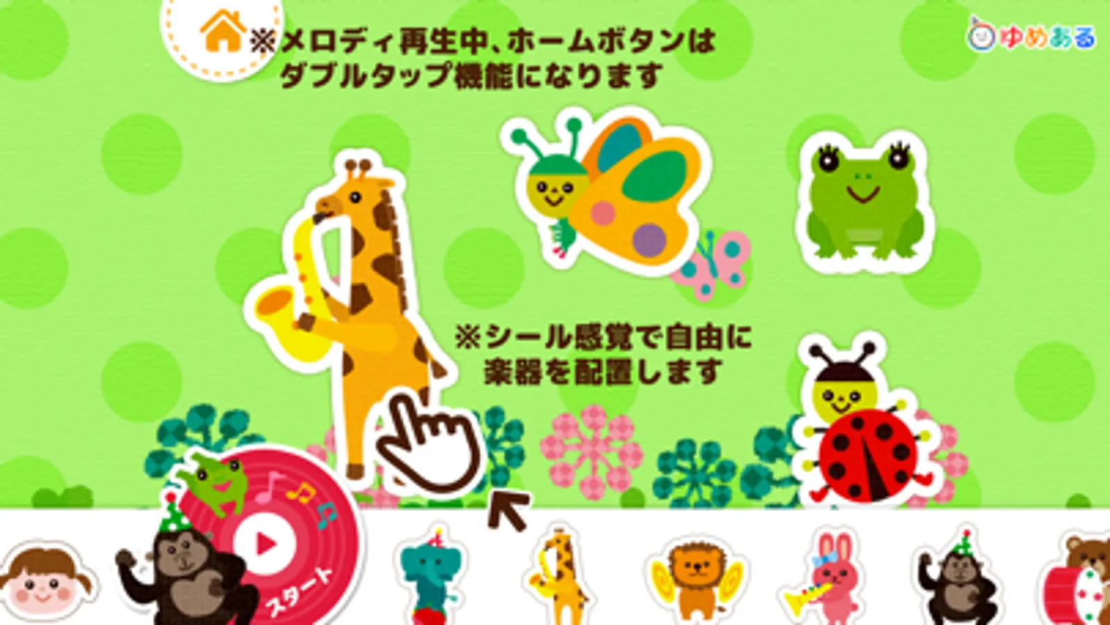 メロディ再生中は、ホームへのボタンはダブルタップ機能になるのでお子様が画面上をタッチしてても安心です。