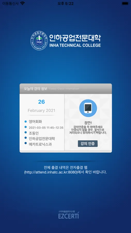 인하공업전문대학의 WEB/APP 기반의 스마트출결관리 시스템은 학사관리의 편리성과 엄정한 수업관리를 위한 시스템으로 NATIVE APP을 바탕으로 출결인증 고유번호를 교수와 학생간 커뮤니케이션 하도록 구현하고 있으며, 넓은 확장성과 높은 호환성을 제공 하는 솔루션 입니다.