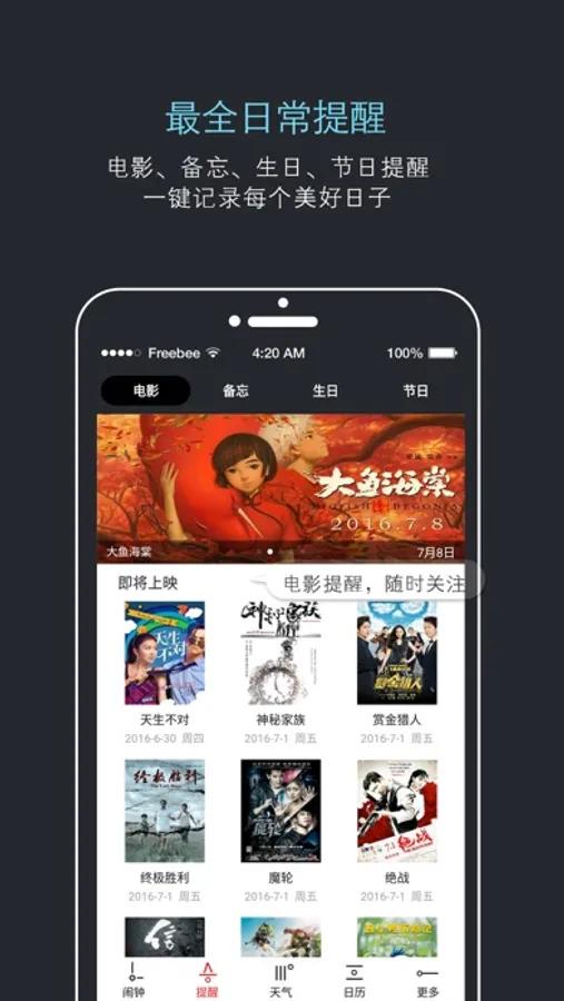 这是一款集闹钟、备忘、日历、天气、电影提醒、生日管家、联系人同步、滴滴出行等日常生活提醒于一体的高规格提醒备忘工具,一站式的生活管家,从此不用再为到处找各种软件而烦恼。