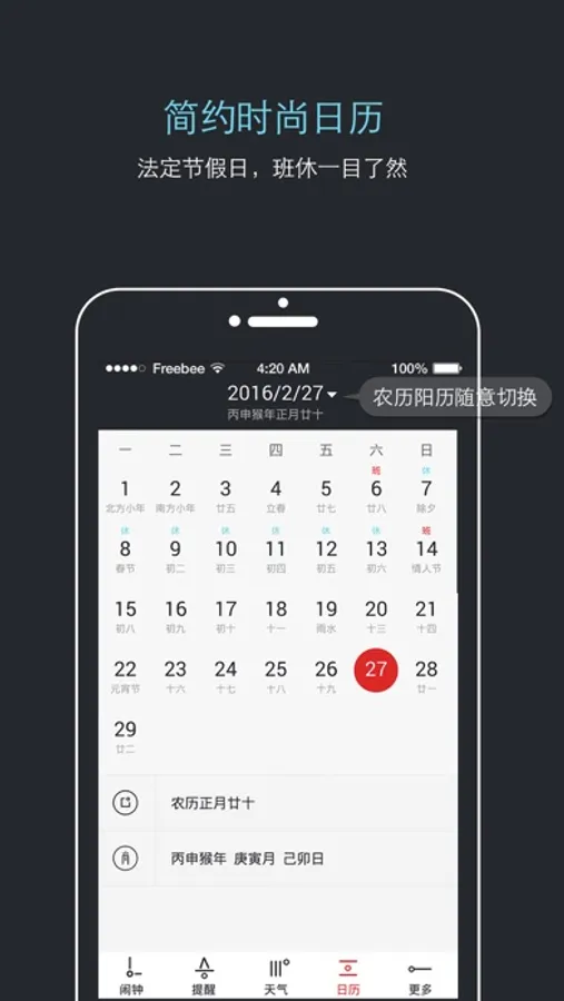 闹钟、天气、日历、万年历、老黄历、联系人同步、记事本、备忘、电影提醒、生日提醒、节日提醒、宜忌、星座运势、生活指数、语音播报、打车出行