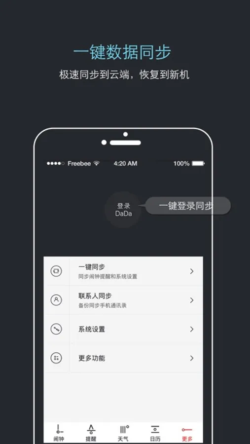 QQ、微信一键登录,备份同步闹钟提醒数。手机联系人一键同步到云端,一键恢复到新机。再也不用为换手机担忧了