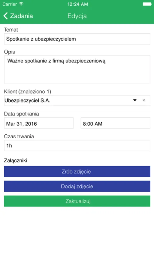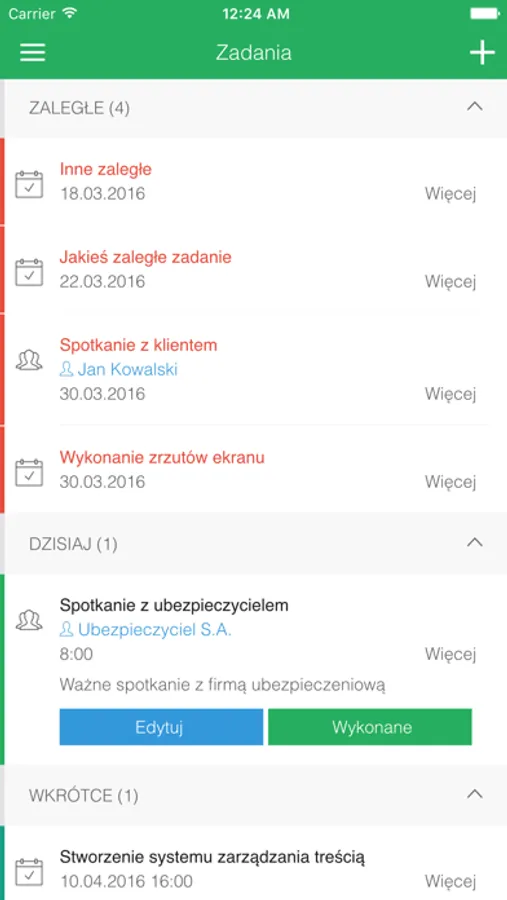 - Terminarz – zarządzanie zadaniami i spotkaniami, w tym: przegląd zdarzeń zaległych, bieżących i nadchodzących, edycja zadań i spotkań, tworzenie notatek z załącznikami graficznymi.