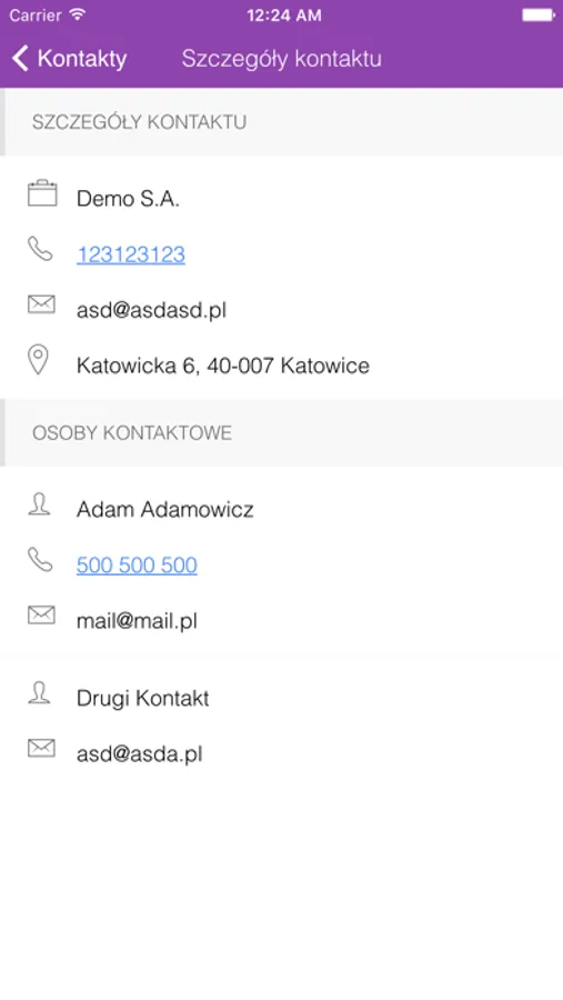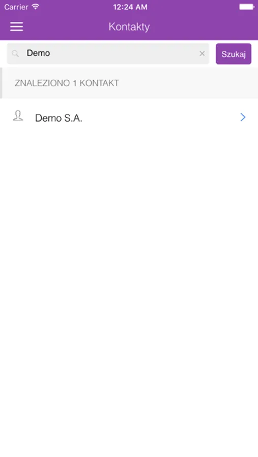 - Baza klientów – przeglądanie systemowej bazy firm i osób kontaktowych. Z poziomu aplikacji można wykonać połączenie telefoniczne, wysłać wiadomość sms/email lub uruchomić GPS z trasą dojazdu do klienta.