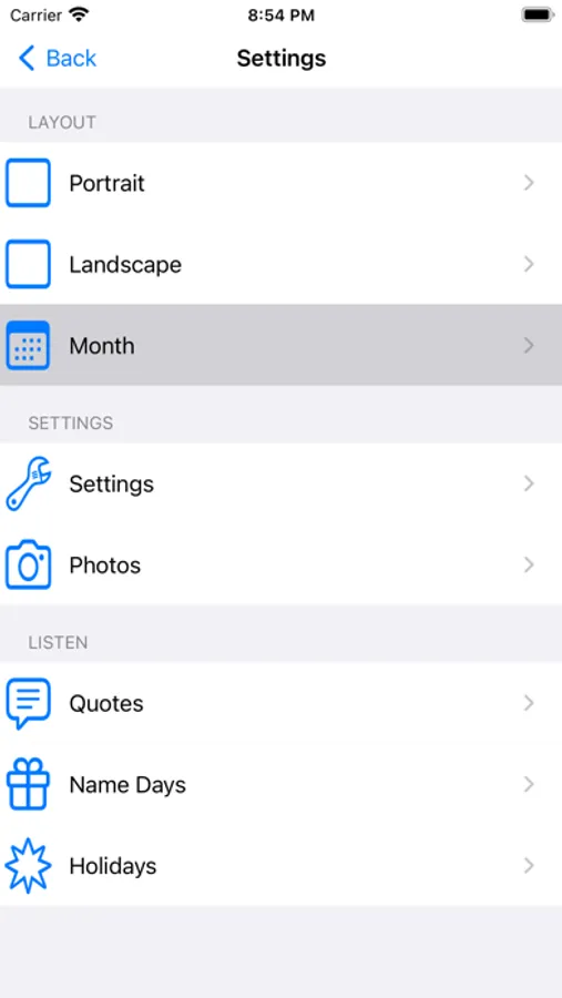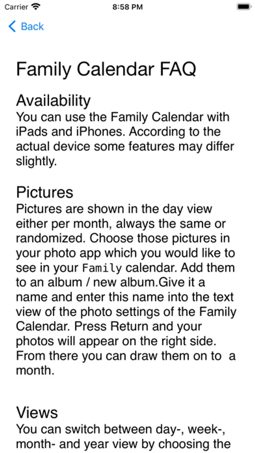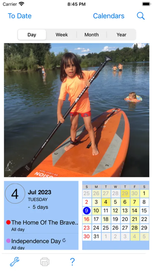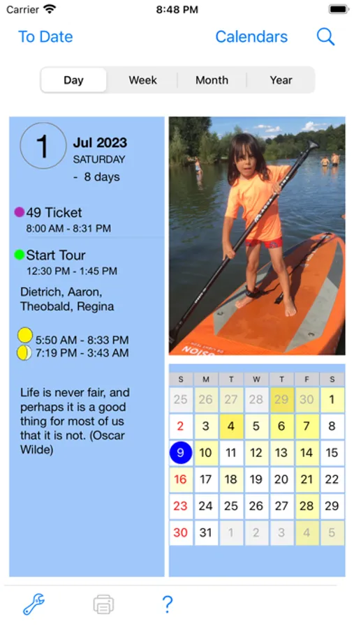 Family Calendar shows you sun and moon rise/set, the actual star sign, name days and a quote of the day. You can easily include your favorite pictures and configure many items according to your taste and needs, font sizes, colours, different layouts