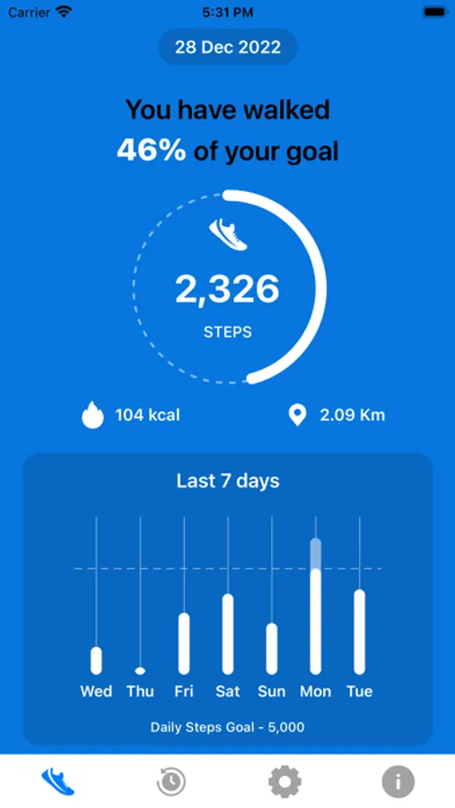 Pedometer records the number of steps you have walked and displays them along with the calories that you have burned, distance travelled and goal achieved in percentages. Also provide history of data in weekly, monthly or yearly list as well as providing graphical representation to display the steps per month, week or year.